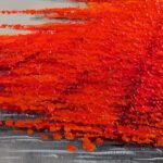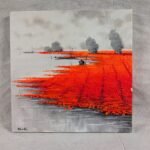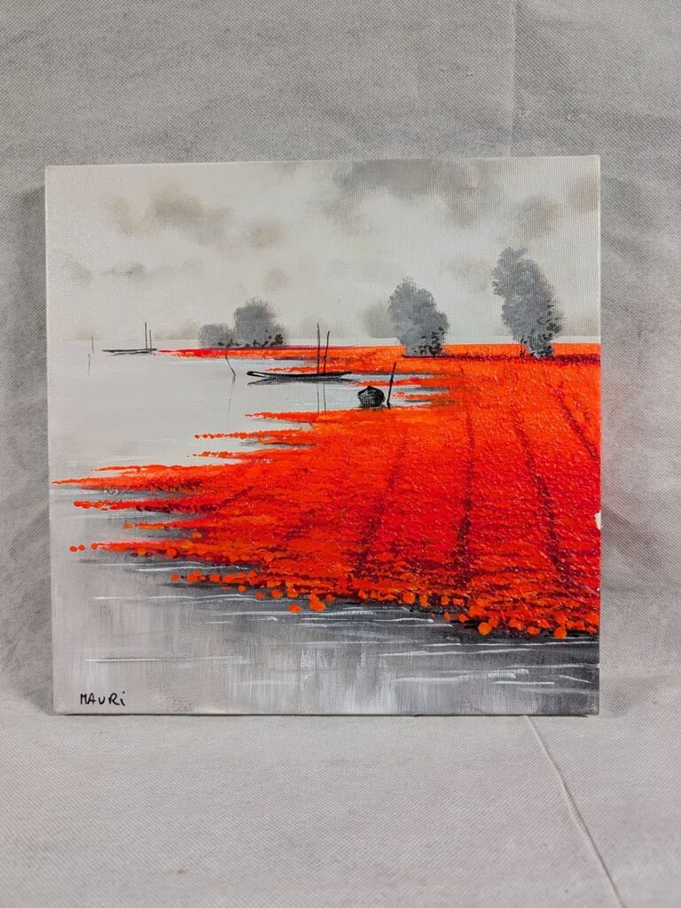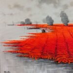 Stile: Il quadro presenta una tecnica paesaggistica che gioca sul contrasto tra un ambiente grigio e arancioni vivaci.