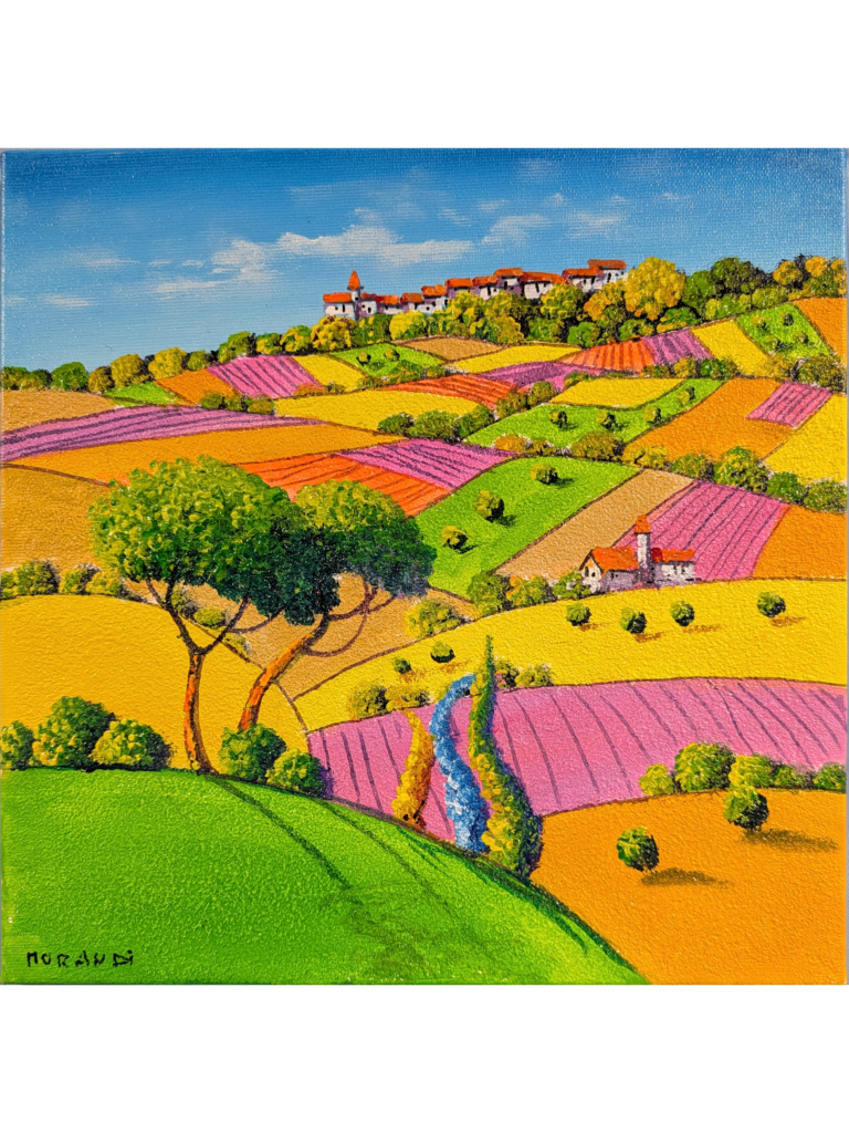 Vi presentiamo un’opera che cattura l’anima e lo spirito vibrante della campagna italiana: un magnifico paesaggio firmato dal maestro del colore, Giulio Morandi.