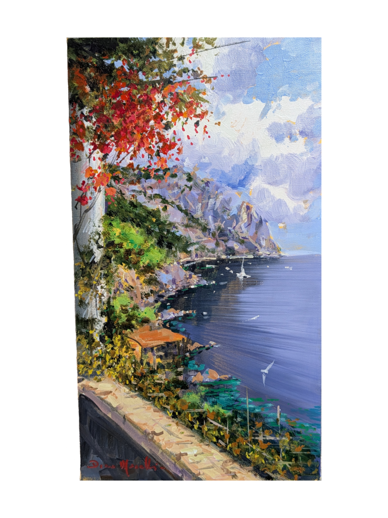 Il dipinto di Giuseppe Longo rappresenta un omaggio alla meravigliosa   costiera amalfitana e al suo stile inconfondibile ambito dai turisti di tutto il mondo.