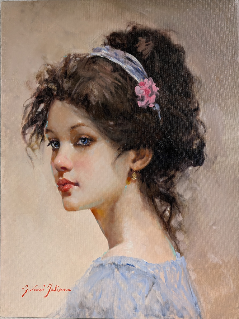 Stile: Lo stile di Faliero fonde tecniche impressioniste con un realismo accademico raffinato, particolarmente evidente nel modo in cui cattura la luce e i dettagli del viso.