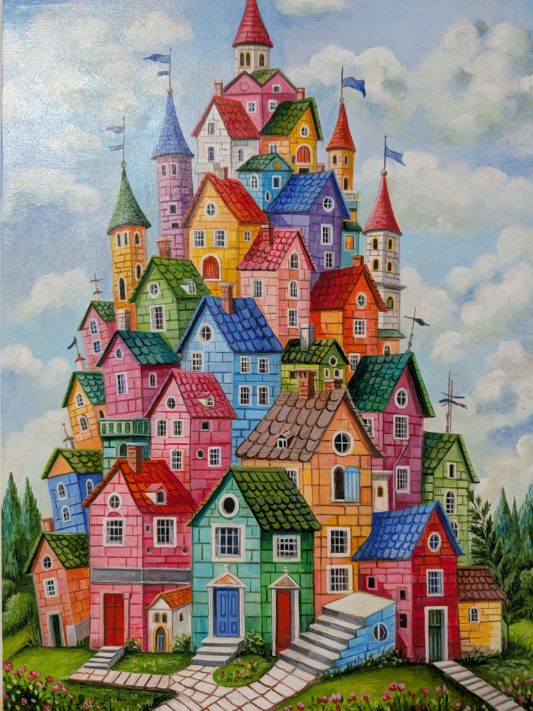 La forza di questo lavoro risiede nell’uso sapiente del colore: i contrasti tra l’azzurro  del cielo e i vari colori delle case  creano un’atmosfera sospesa tra realtà e poesia. Si avverte quasi il calore della prima ora del giorno e il silenzio del borgo.