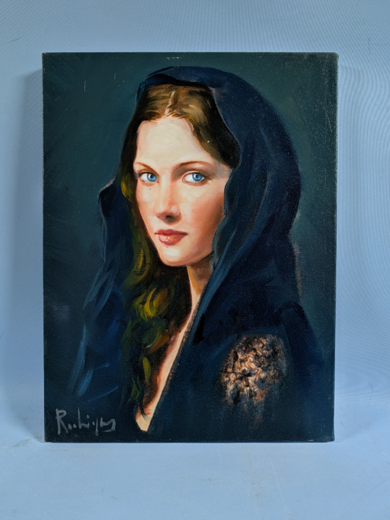 In questa splendida opera intitolata il maestro Salvatore Rodriquez ci offre un ritratto femminile di rara intensità e raffinatezza. Il soggetto con  il suo sguardo diretto allo spettatore evoca mistero e fascino.